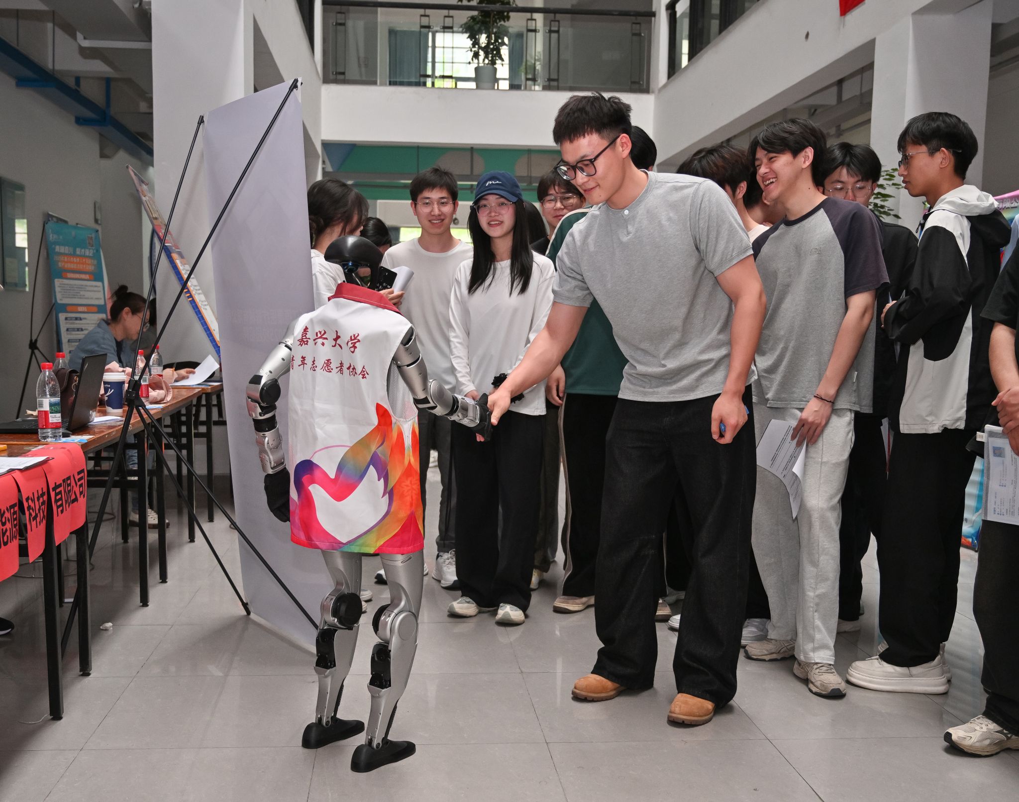 学院领导深入招聘会现场,与用人单位及毕业生亲切交谈,实地调研企业用人需求,与毕业生亲切交流,为求职学生提供精准对接和指导现场人头攒动,气氛热烈,浙江和炎能源科技有限公司带来的宇树科技人形机器人成为会场一大亮点,为招聘会增添了科技魅力。机器人展示了行走、挥手问候、握手等基本动作,展现出灵活的动态性能。学生们纷纷围上前,或试探性打招呼,或伸手触摸。机器人工程专业的杨同学表示:“这次互动体验让我对智能机器人领域产生了更浓厚的兴趣,也更加明确了自己的职业发展方向。